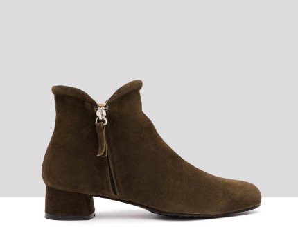 22413 - Low heeled ankle boots in khaki green suede leather. Simple cut design with curved ankle strap and external zip detail with tone on tone puller with opening. Maximum adjustment to the ankle and heel by means of a brown zip on the inside with tone on tone puller.Slightly rounded toe for a casual and dynamic style. Wide base heel for absolute comfort. Natural leather lining. Soft cushioned insole.