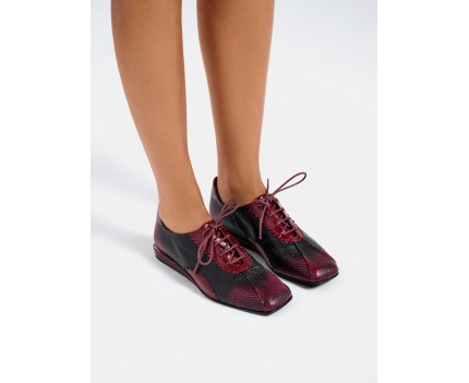 22886 - Low heeled shoe in black gloss leather with multicoloured leather in different textures. Exclusive blucher style design with black laces and square toe. Perfect fit at the heel and maximum support at the ankle. Wide base heel in black glossy leather with absolute comfort. Natural leather lining. Soft padded insole.