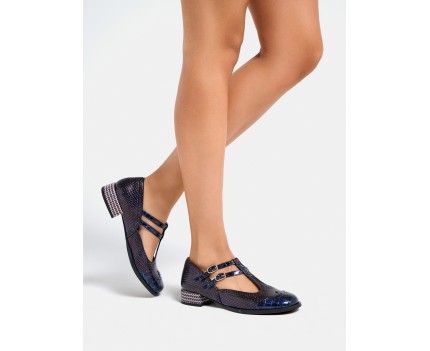 22870 - Low heeled shoe in black engraved suede leather combined. Mary Jane' style design with piece on the instep in beige engraved leather. Detailed with two laces on the straps that provide a perfect fit with a buckle and maximum support on the ankle. Slightly rounded toe and wide-based black heel with absolute comfort lined in tone. Natural leather lining. Soft cushioned insole.