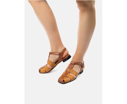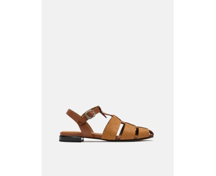22965 - Low heeled sandals in brown embossed leather. An elegant design featuring a strap and buckle with a cuff that provides a snug fit and support around the ankle. Soft, padded leather insole. Comfortable wide base heel. Natural leather lining.