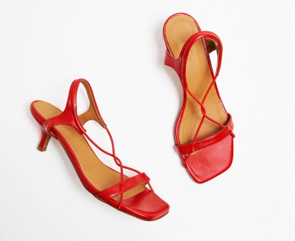 22808 - Mid heeled sandal in red nappa leather. Minimalist design with piece in the vamp and crisscrossed rubber with a perfect fit to the instep. Soft padded insole in leather. Elegant and comfortable exclusive heel. Lining in 100% leather.