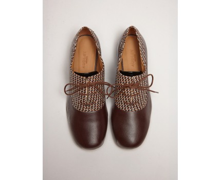 22882 - Zapato de tacón bajo en piel nappa marrón con piel estampada multicolor. Diseño exclusivo estilo blucher con cordonera al tono marrón y puntera redondeada. Ajuste perfecto al talón y máxima sujeción en el tobillo. Tacón de base ancha en piel con absoluto confort. Forro en piel natural. Planta acolchado soft.