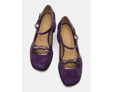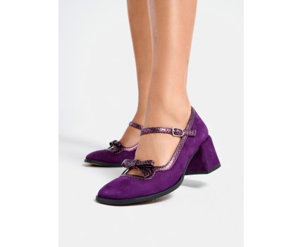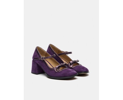 22869 - Zapato de tacón medio en piel de ante violeta. Diseño estilo 'Mary Jane' renovado con tres correas con hebillas al tono sobre el empeine creando un efecto estiloso y moderno. Ajuste perfecto sobre el empine por sus correas adaptables al pie dando máxima sujeción en el tobillo y talón. Puntera ligeramente cuadrada y tacón forrado suela en negro de base ancha proporcionando absoluto confort. Forro en piel natural. Planta acolchado soft.