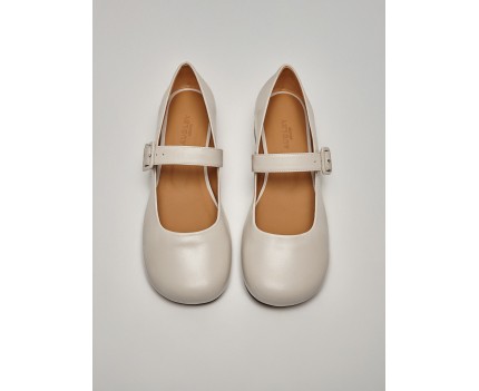 22847 - Zapato de tacón bajo en piel nappa marfil. Diseño estilo 'Mary Jane' con piezas sobre el empeine en piel grabada beige que aportan un ajuste perfecto con correa y hebilla otorgando máxima sujeción en el tobillo. Sobre éstas, adorno detalle de dos lazos, en piel de ante negro, creando un estilo sofisticado y, especial sobre esta pieza. Puntera ligeramente redonda y tacón negro de base ancha con absoluto confort forrado al tono. Forro en piel natural. Planta acolchado soft.