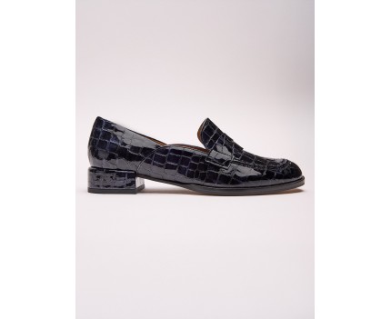 22829 - Zapato de tacón bajo en piel negro brillo efecto cocó. Diseño estilo mocasín con detalle del tacón forrado en la misma piel. Ajuste perfecto al talón y máxima sujeción en el tobillo. Puntera ligeramente redondeada y tacón de base ancha con absoluto confort. Forro en piel natural. Planta acolchado soft.