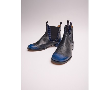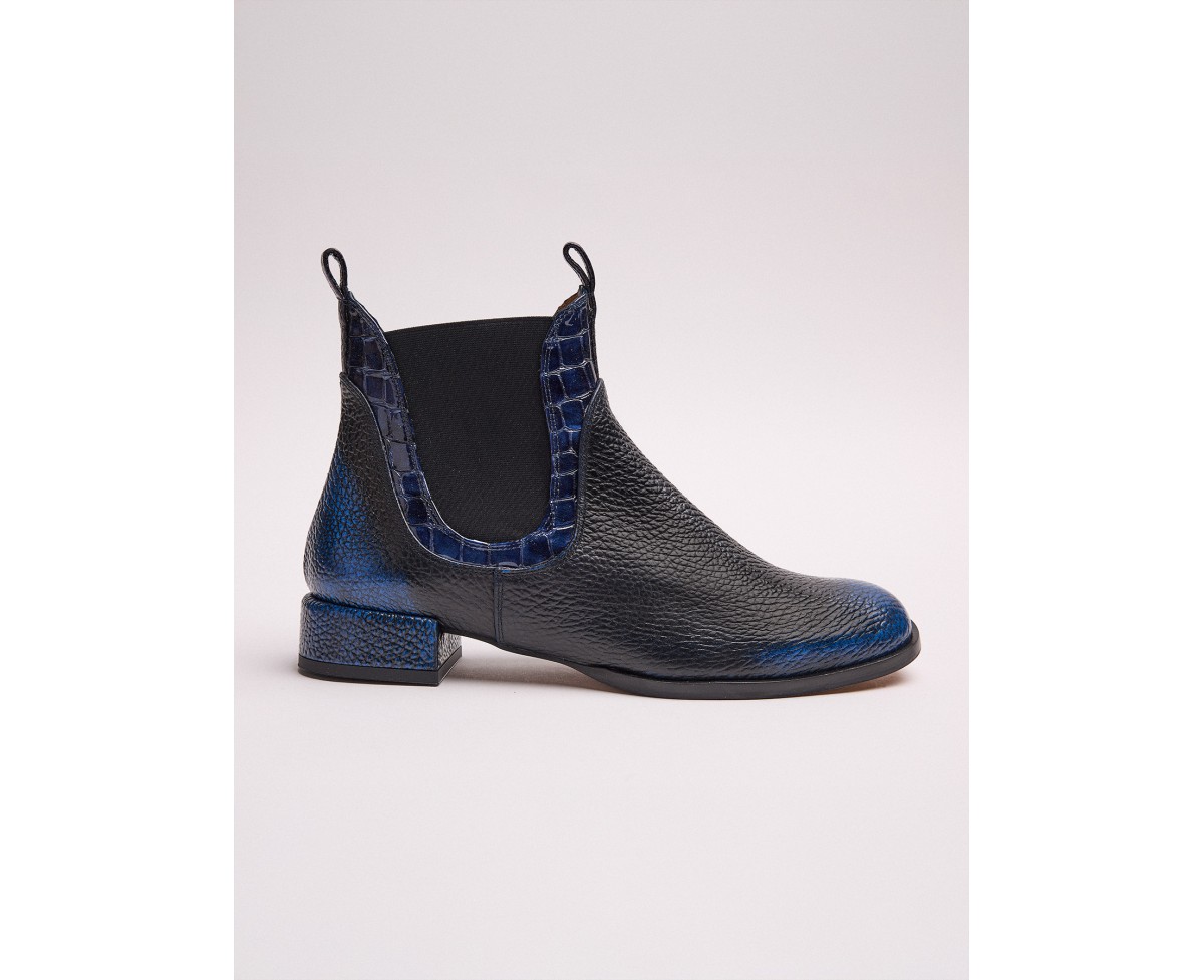 Botín de tacón bajo en piel negro combinada con tonos azul marino