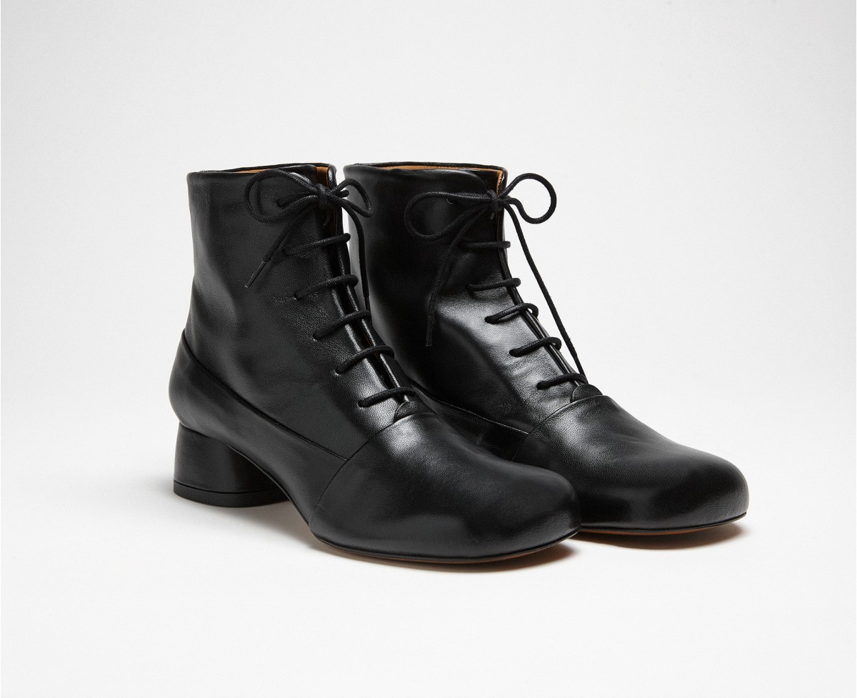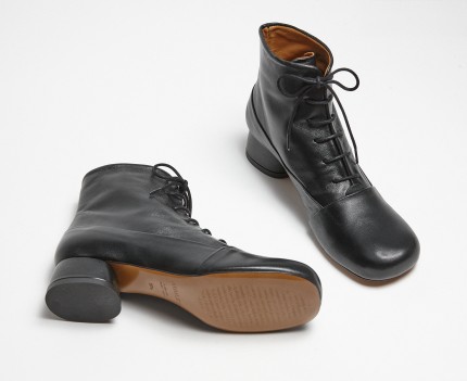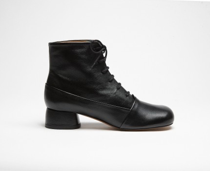 22706 - Botín de tacón bajo en piel negro. Diseño de corte sencillo con cremallera lateral con tirador al tono a modo de adorno y cordones. Máximo ajuste al empeine y al tobillo y talón en piel suave. Puntera ligeramente redondeada aportando estilo casual y dinámico. Tacón de base ancha para absoluto confort. Forro en piel natural. Planta acolchado soft.