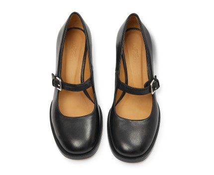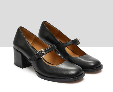22641 - Zapato de tacón medio en piel negro. Diseño estilo 'Mary Jane' con correa con hebilla redondeada a modo detalle y escote redondo. Ajuste perfecto con correa y hebilla dando máxima sujeción en el tobillo. Puntera ligeramente redondeada y tacón en piel negro de base ancha con absoluto confort. Forro en piel natural. Planta acolchado soft.