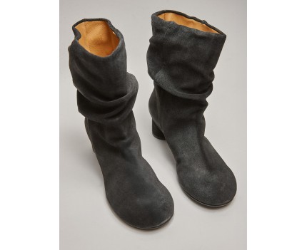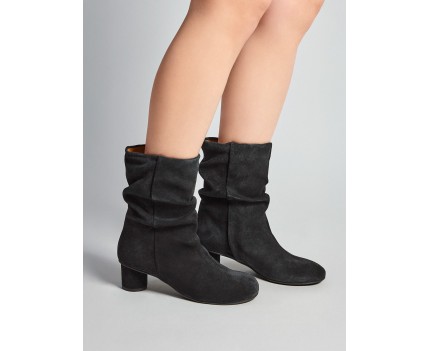 Botín de tacón bajo en piel serraje negro con efecto arrugado