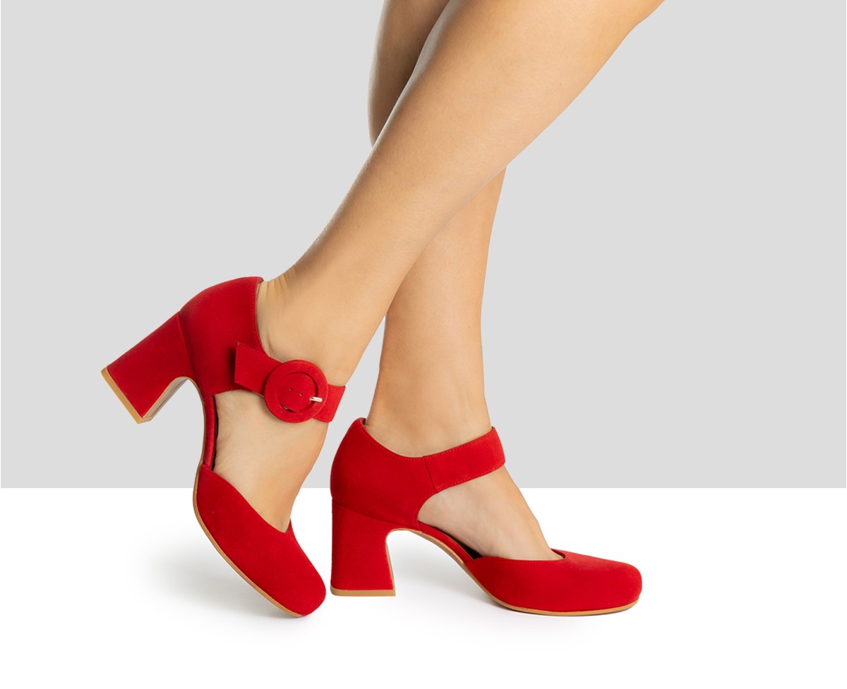21517 - Zapato semiabierto de tacón medio en piel de ante rojo. Diseño con elegante escote en pico con piezas entre puestas combinadas en piel de ante y piel con exclusivo grabado trenzado. Confortable puntera redondeada y ajuste perfecto mediante correa con hebilla y acople al talón. Dinámico y confortable tacón con base ancha al tono y bonito perfil curvo.