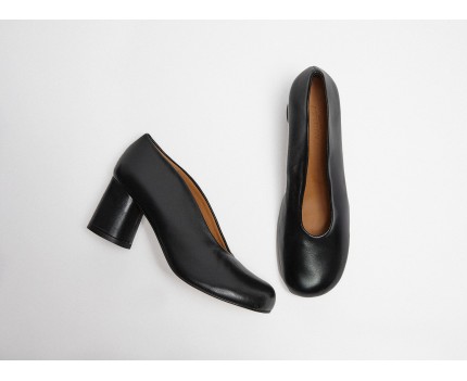 22438 - Zapato de tacón medio en piel negro. Diseño estilo salón con escote redondeado y puntera redondeada. Ajuste perfecto al talón y máxima sujeción en el tobillo. Tacón de base ancha al tono con absoluto confort. Forro en piel natural. Planta acolchado soft.