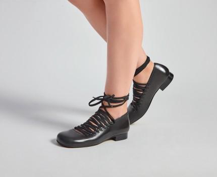 22745 - Zapato de tacón bajo en piel negro con cordón al tono. Diseño estilo bailarina con exclusiva entrelazada con cordones en el empeine para abrochar con lazada al tobillo. Ajuste perfecto al talón. Puntera redondeada con escote bajo y tacón con base ancha. Forro en piel natural. Planta acolchado soft.