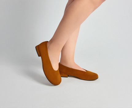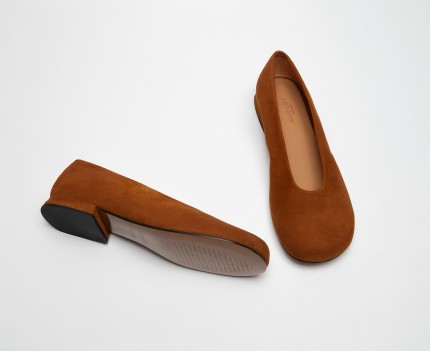 22454 - Zapato de tacón bajo en piel de ante marrón cuero. Diseño estilo mocasín renovado en piel lisa con escote redondeado y puntera redondeada. Ajuste perfecto al talón y máxima sujeción en el tobillo. Tacón de base ancha al tono con absoluto confort. Forro en piel natural. Planta acolchado soft.