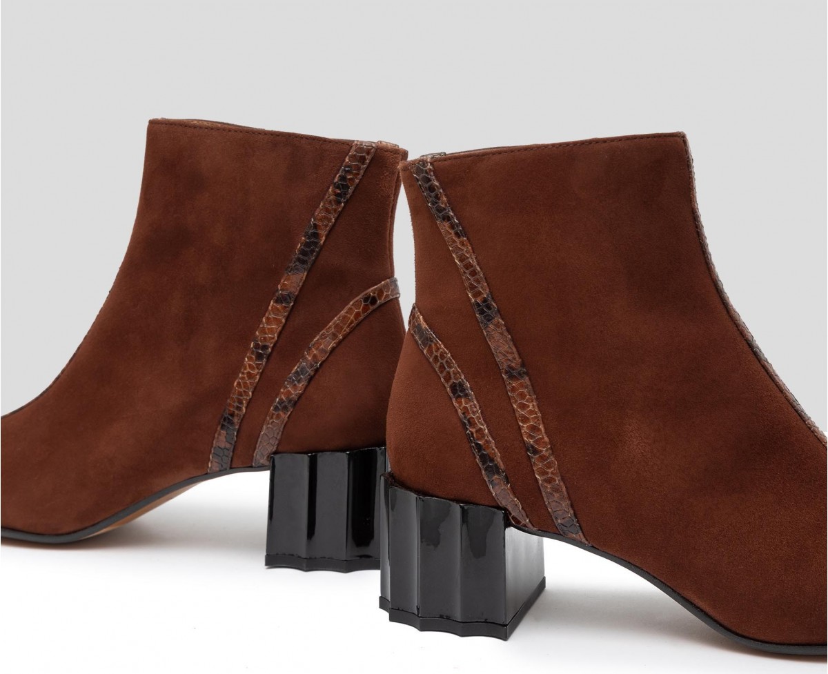 Stivaletti con tacco medio in pelle scamosciata marrone caffè con dettagli in stampa animalier
