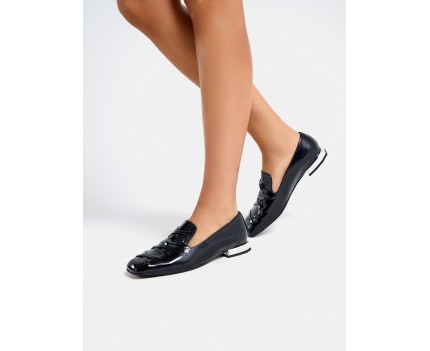 22827 - Scarpa con tacco basso in pelle nera con finiture. Modello a mocassino con nappina in pelle stampata multicolore sulla tomaia e dettaglio sul tallone foderato in pelle a contrasto. Calzata perfetta sul tallone e massimo sostegno alla caviglia. Punta leggermente arrotondata e tacco a base larga per un comfort assoluto. Fodera in pelle naturale. Soletta morbida e ammortizzata.