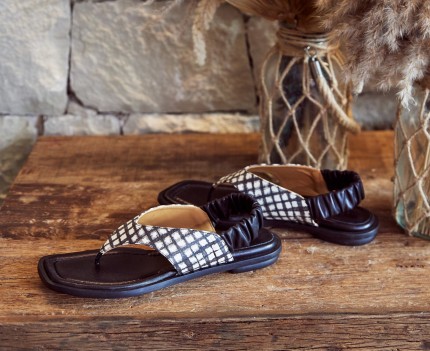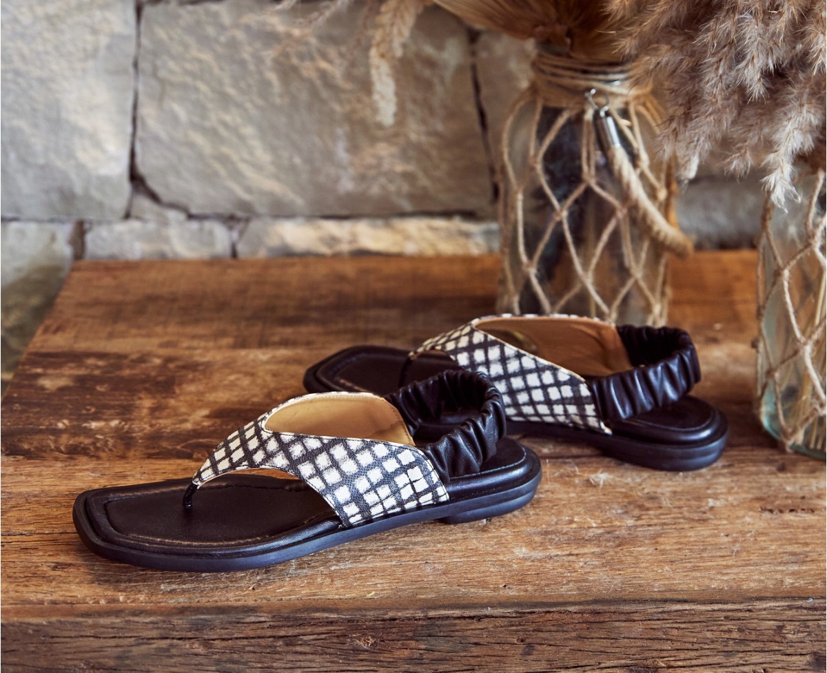 Sandali a tacco basso in pelle nera con stampa a quadri bianchi e neri