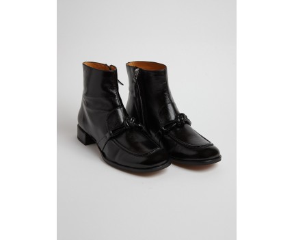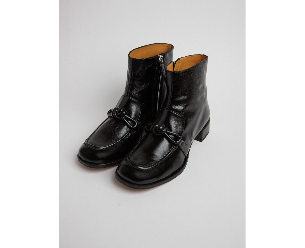 22872 - Stivaletti con tacco basso in pelle nera verniciata lucida e rugosa. Design semplice con dettaglio decorativo a forma di nodo in tinta. Si adattano perfettamente al piede, avvolgendo il collo del piede, la caviglia e il tallone grazie alla tomaia aderente in morbida pelle. Punta leggermente squadrata per uno stile casual e dinamico. Tacco a base larga per un comfort assoluto. Fodera in pelle naturale. Soletta morbida e ammortizzata.
