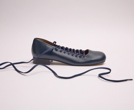 22745 - Scarpe con tacco basso in pelle blu navy. Design stile ballerina con esclusivi lacci intrecciati sul collo del piede e allacciatura alla caviglia. Perfetta aderenza al tallone. Punta arrotondata con scollatura bassa e tacco largo. Fodera in pelle naturale. Soletta morbida e ammortizzata.